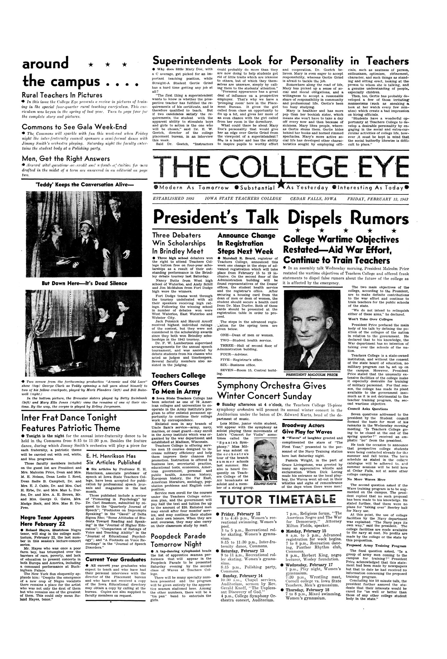 President's talk dispels rumors; college wartime objectives restated--aid war effort, continue to train teachers