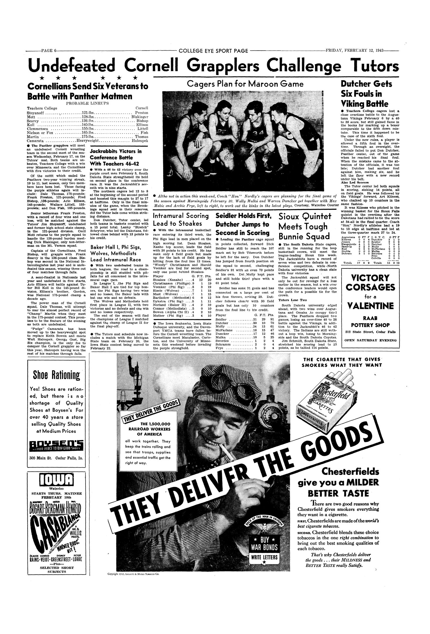 | Undefeated Cornell grapplers challenge Tutors; Cornellians send six veterans to battle with Panther matmen | Unbeaten TC will face the unbeaten Cornell team. |