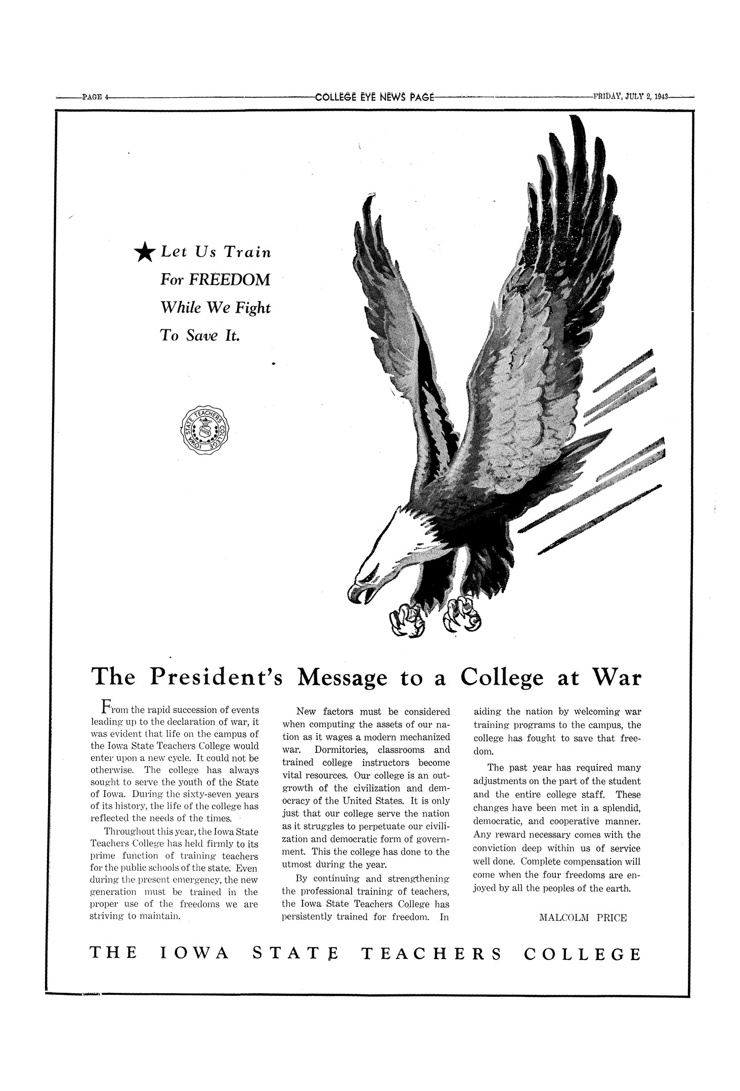 The President's message to a college at war President Malcolm Price claims that it is vital to continue to educate and train teachers during the war.
