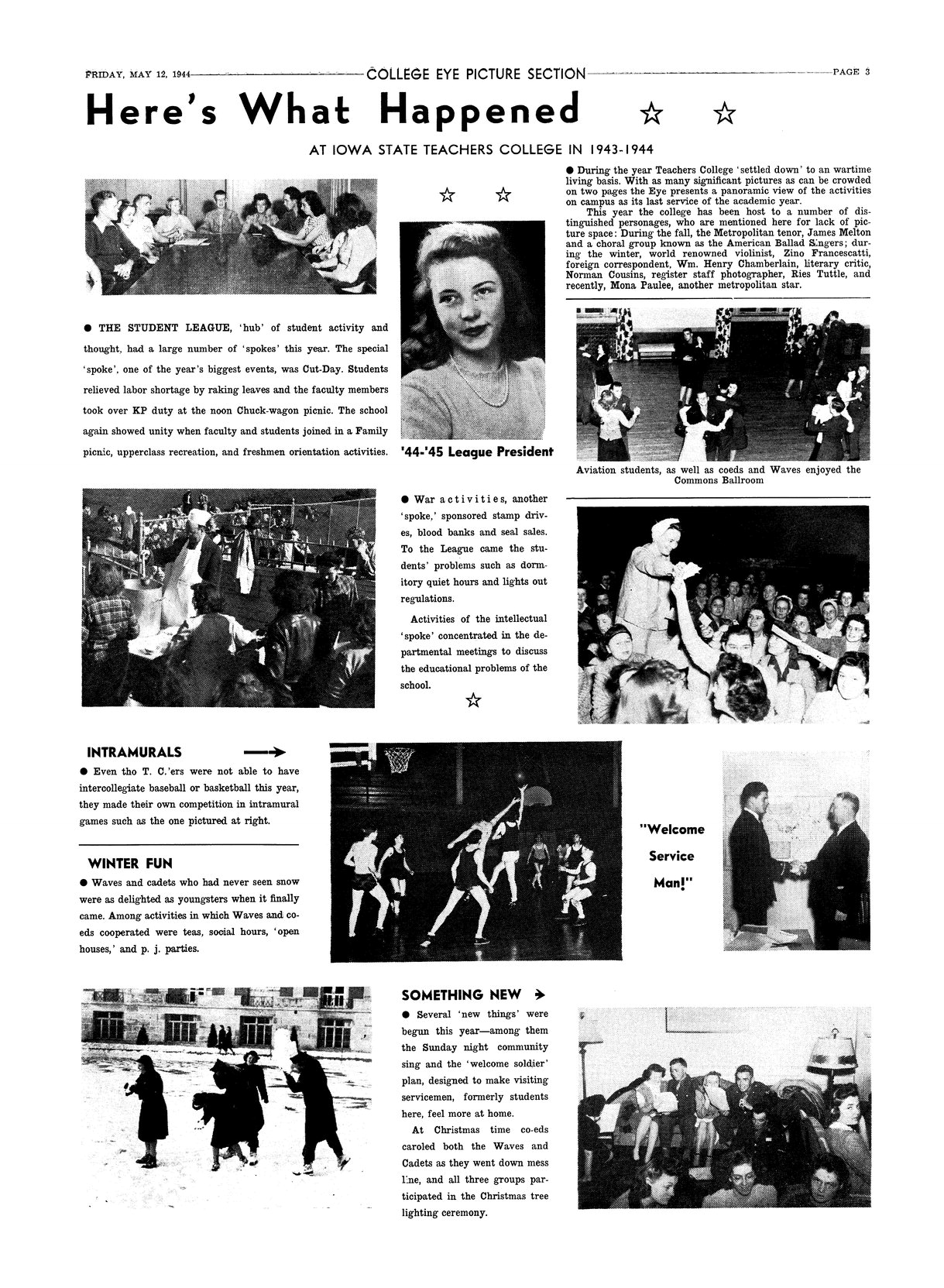 | Here's what happened at Iowa State Teachers College in 1943-1944 | Photos of activities and people throughout the year; photo. |