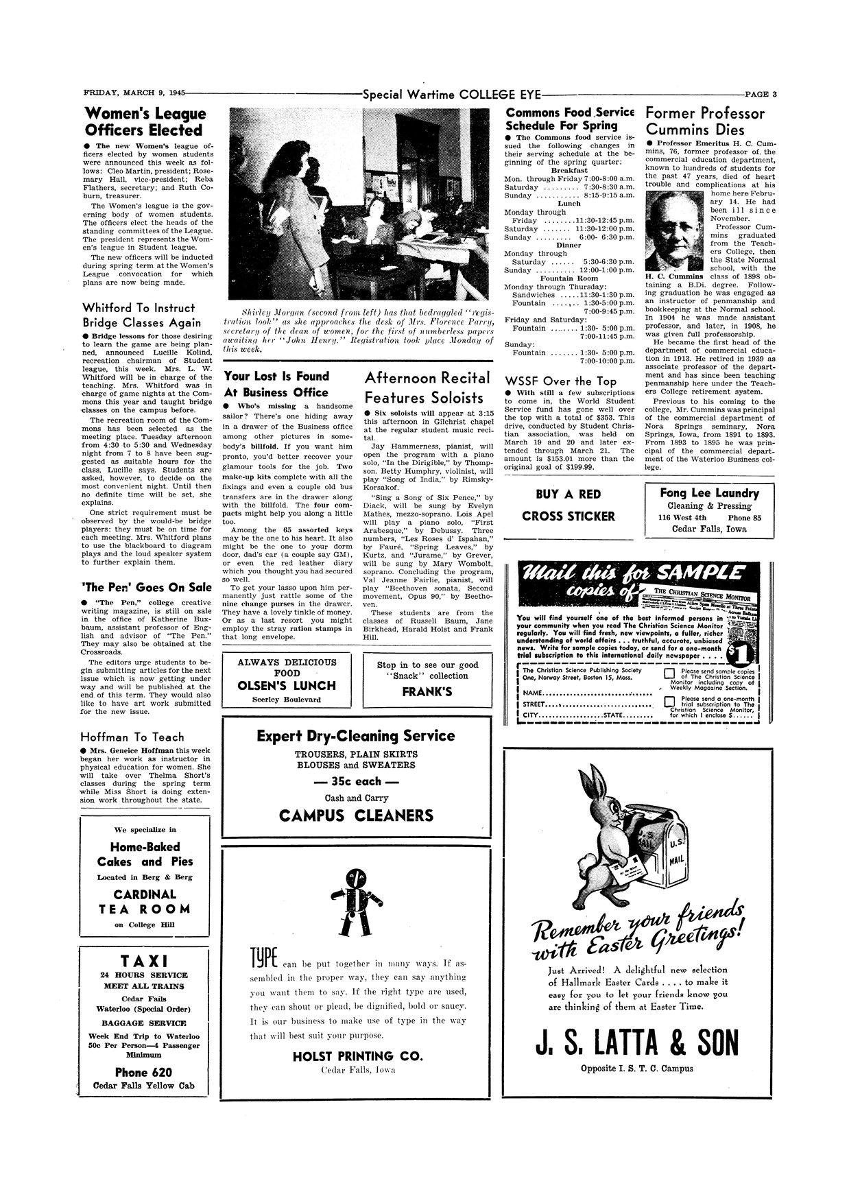 | Former Professor Cummins dies | Harry C. Cummins died February 14, 1945; photo. |