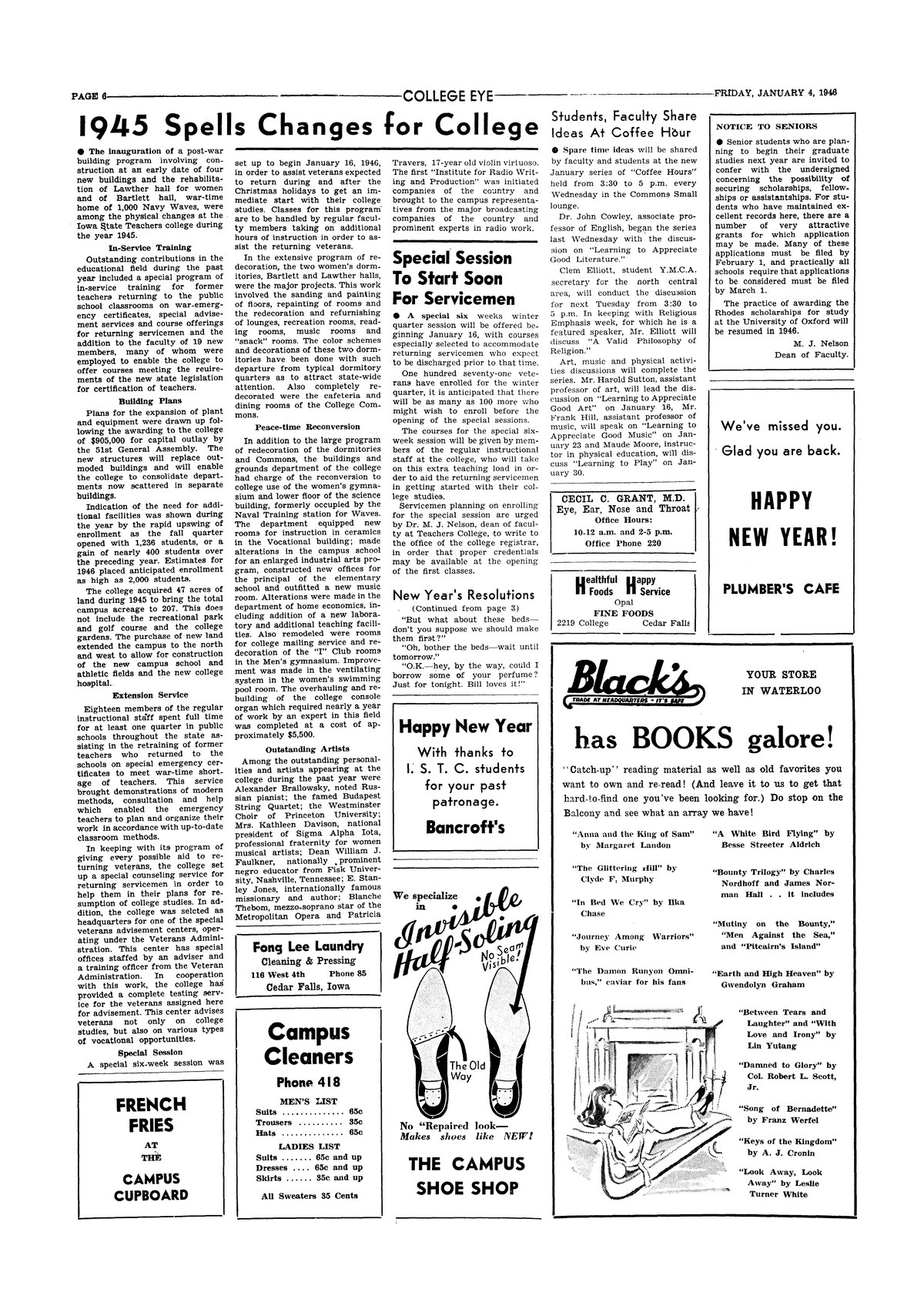 | 1945 spells changes for college | Lengthy look at building plans, land acquisition, extension work, return of faculty, converting campus to peace-time activities, and campus entertainment. |