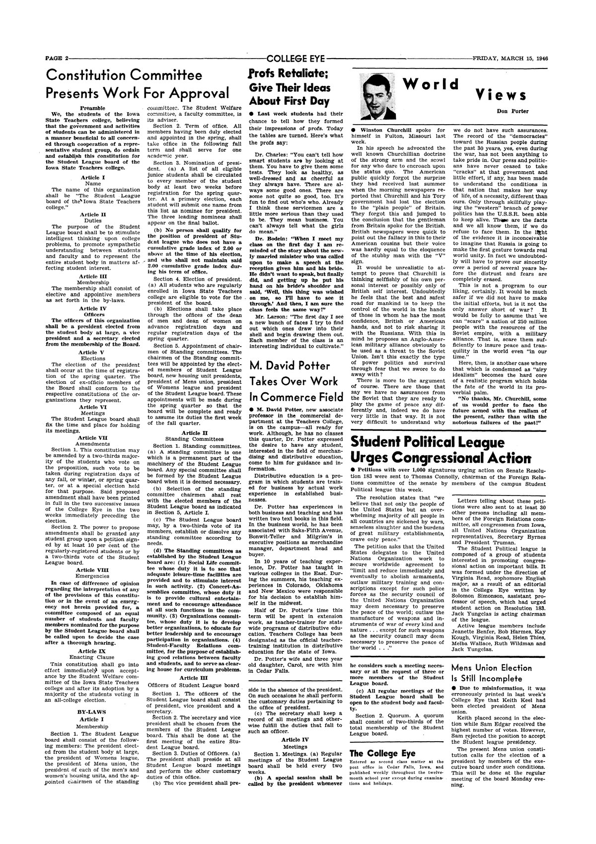 | Student Political League urges congressional action | Supports formation of United Nations. |