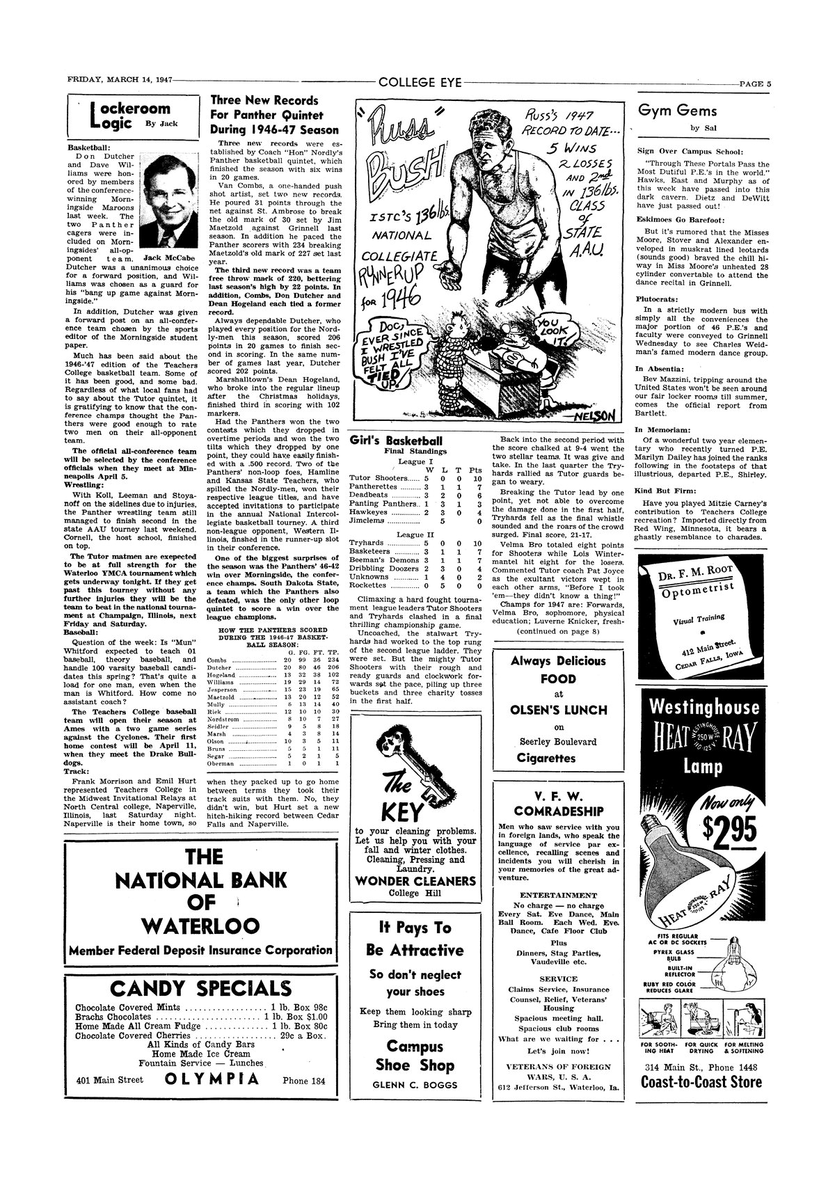 | Three new records for Panther quintet during 1946-47 season | Van Combs set the record of 31 points in a game and an over all scoring record for the season of 234 points; the last record set was the team's overall free throw mark of 220. |