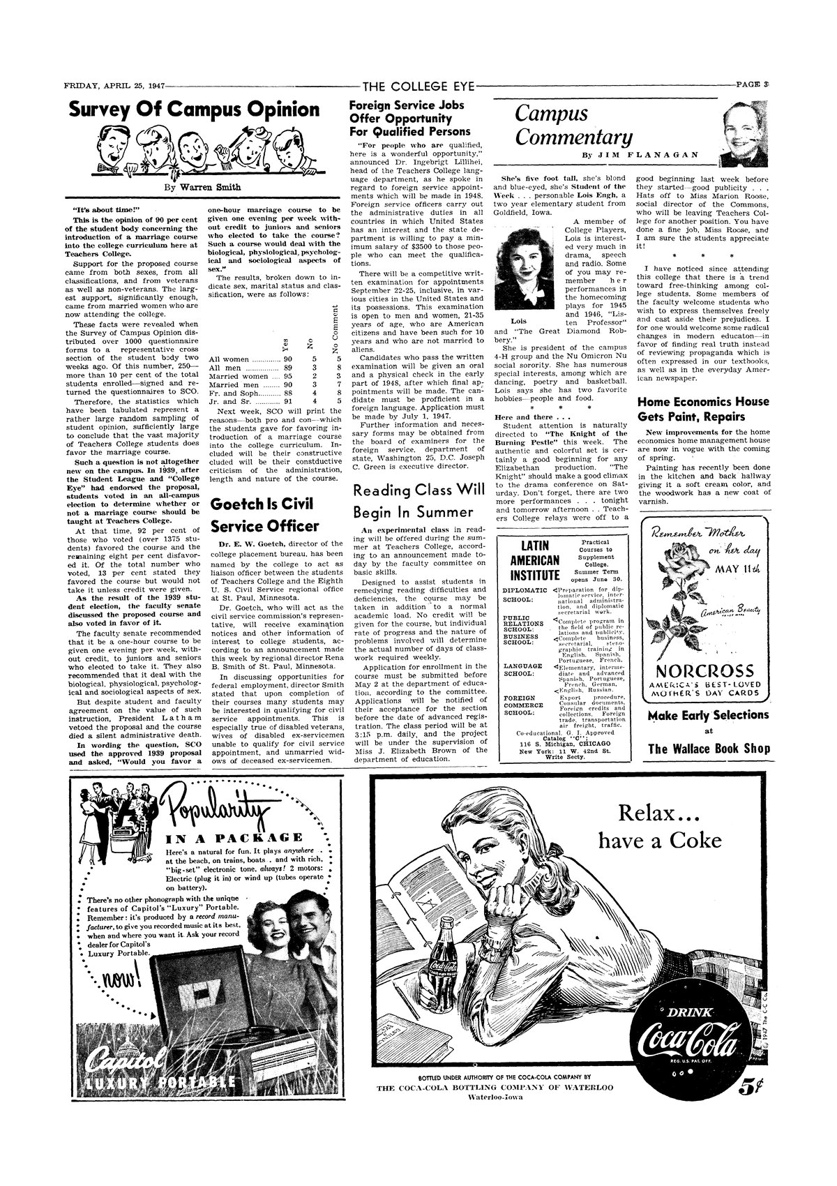 Campus Commentary Announces Lois Engh as Student of the Week, the showing of the spring play, and the free-thinking of many students on the TC campus; photo.