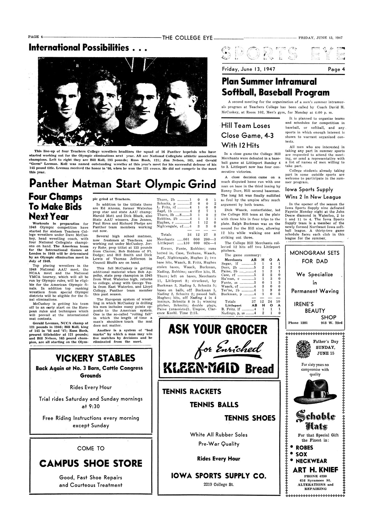 | Hill team loses close game, 4-3 with 12 hits | College Hill Merchants lose to Littleport. |