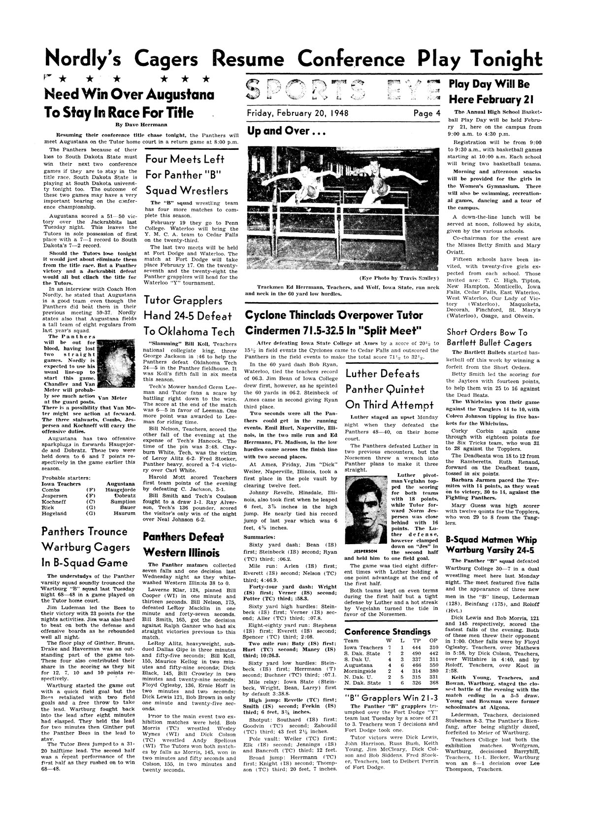 Four meets left for Panther "B" squad wrestlers "B" squad wrestlers will finish up the season with meets against Penn College, the Y. M. C. A., Fort Dodge, and the "Y" tournament in Waterloo.