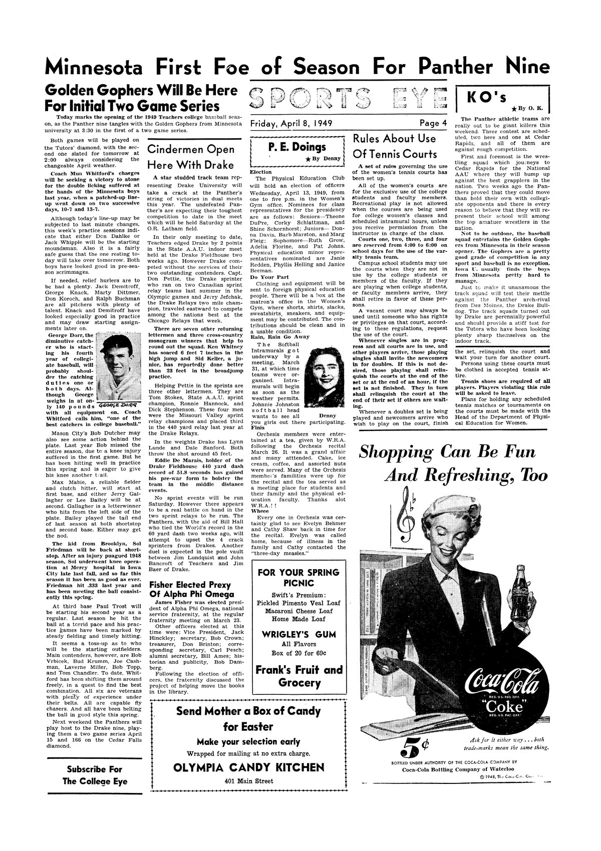 | Minnesota first foe of season for Panthers nine; Golden Gophers will be here for initial two game series | Starting pitcher could be Don Dahlke or Jack Whipple; photo. |