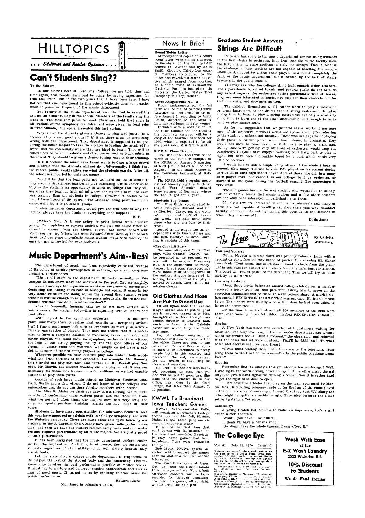 | Hilltopics; can't students sing? | Believes students should be given the leads in the musical productions rather than the faculty performing them. |