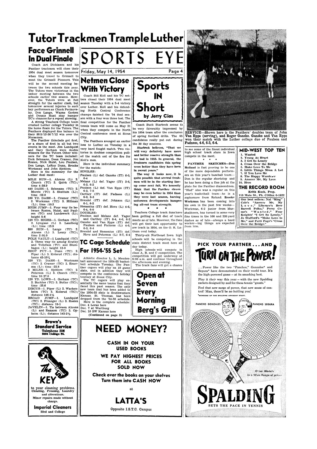 | Tutor trackmen trample Luther; face Grinnell in dual finale | TC defeats Luther, 88 5/12-36 7/12; results are posted. |