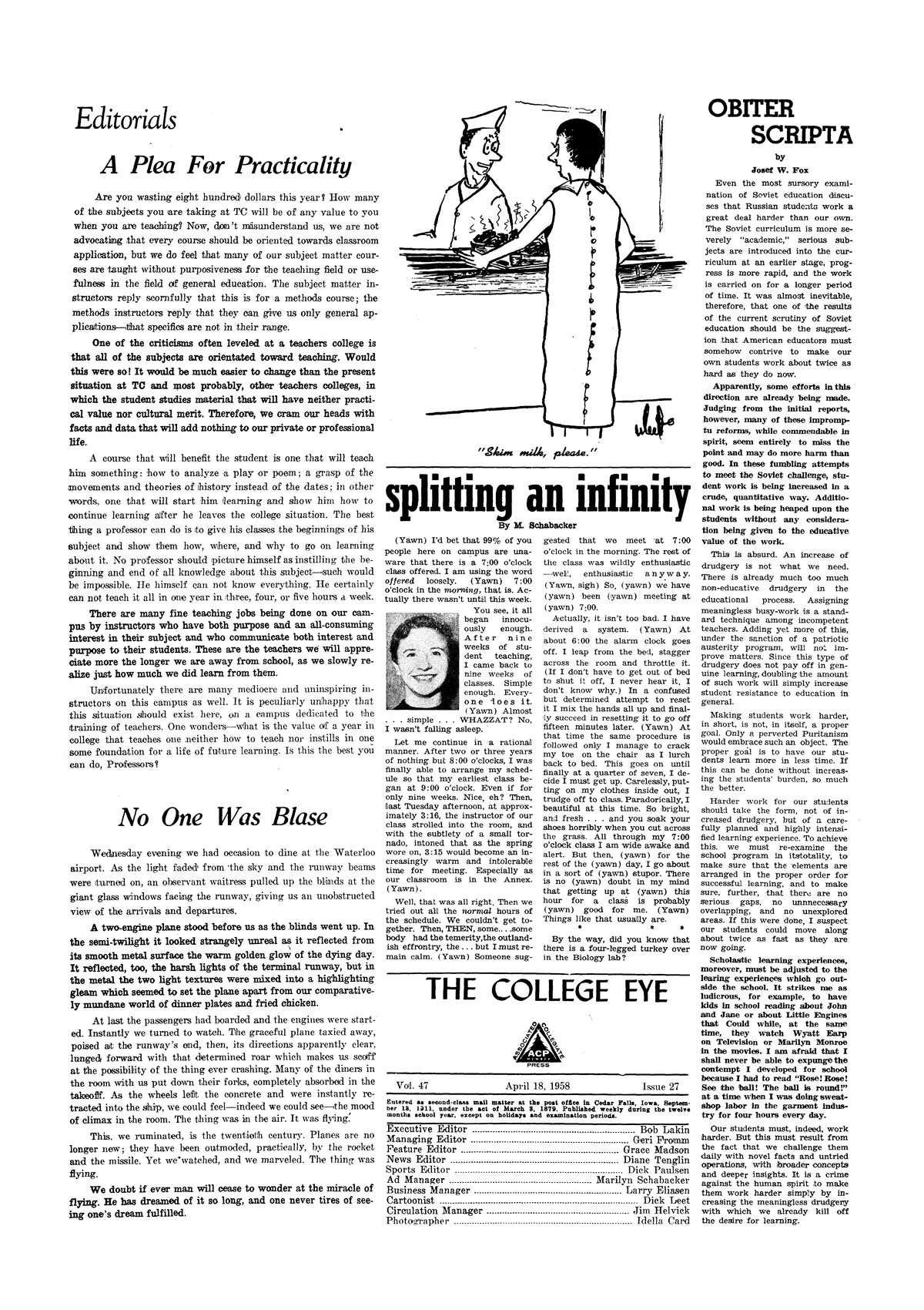 | Splitting an Infinity | Class at 7:00 AM isn't all it's cracked up to be, and there is a four-legged turkey in the biology lab. |