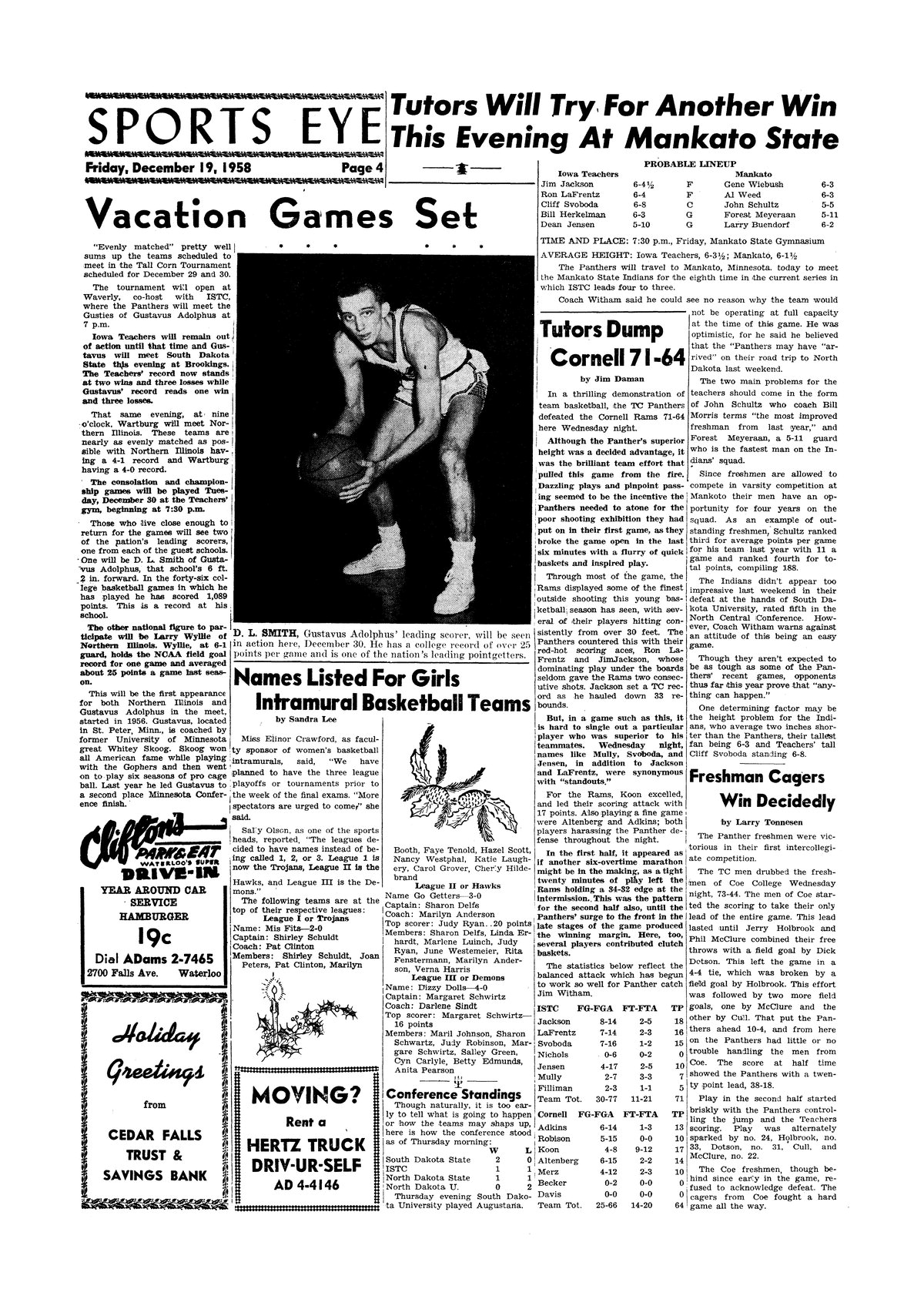 | Vacation games set | Lists the competition over the holiday break; D. L. Smith, player from Gustavus Adolphus, is pictured; photo. |