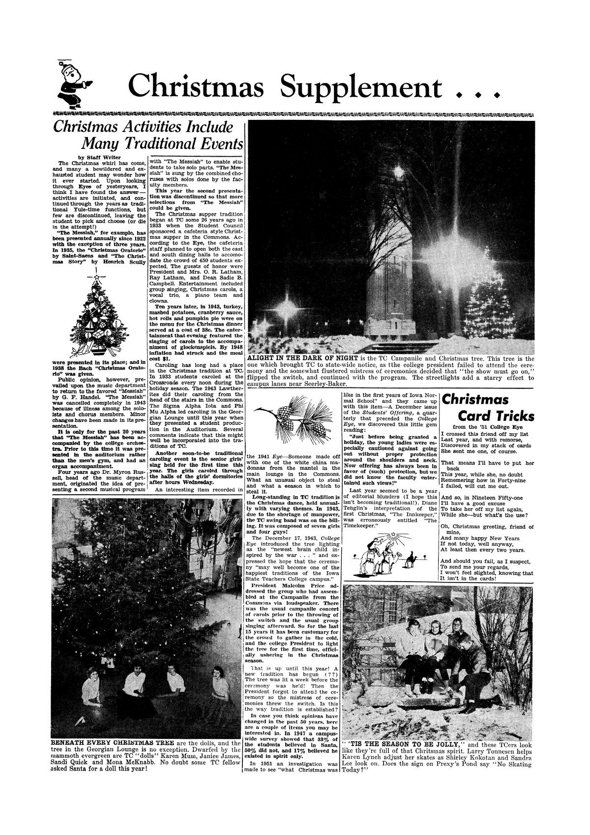 Christmas activities include many traditional events A look at campus holiday traditions, including Christmas dinner, the Messiah performance, caroling, and the tree lighting; photo.