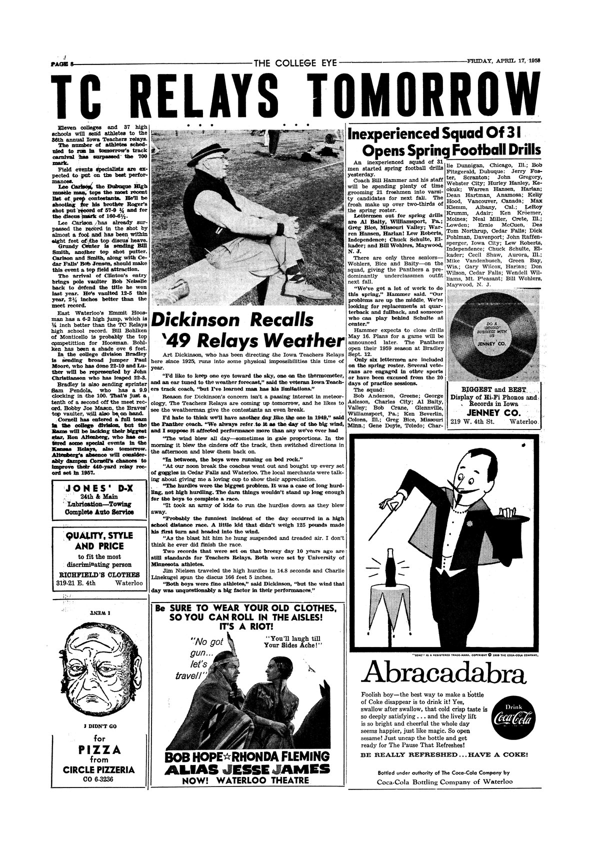 | Dickinson recalls '49 Relays weather | Discusses a big wind storm from a past meet; photo. |