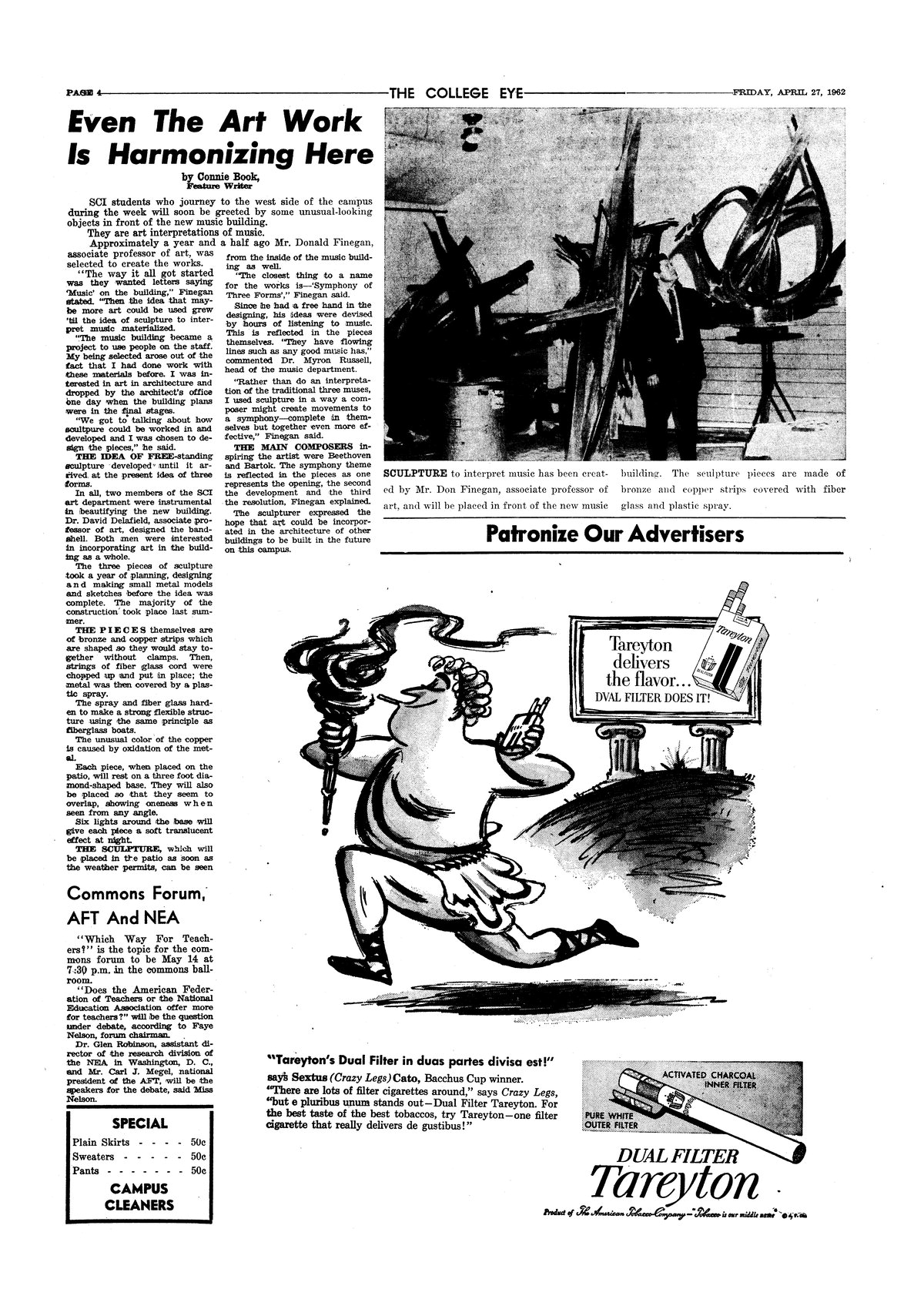 | Even the art work is harmonizing here | Professor Finegan talks at length about his new sculpture that will be placed in front of the Music Building; photo. |
