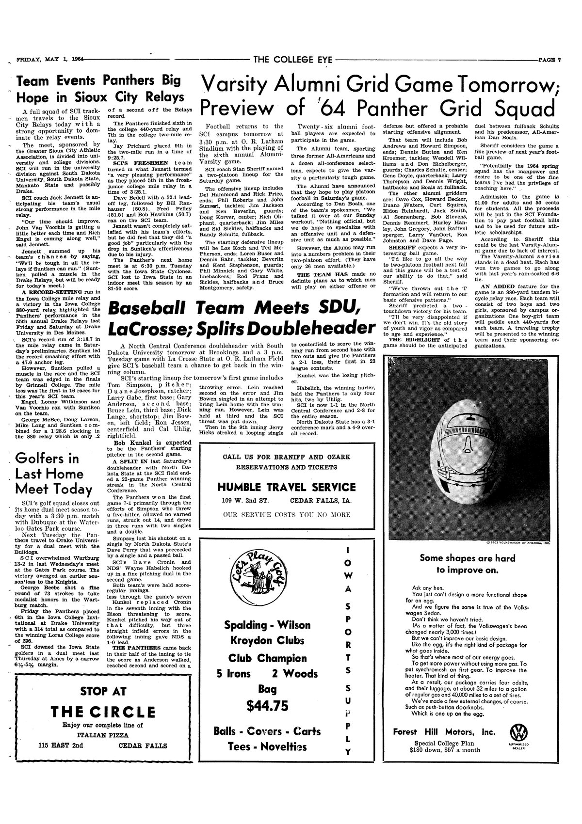 Baseball team meets SDU, LaCrosse; splits doubleheader SCI faces doubleheader against South Dakota University; Panthers split doubleheader against North Dakota State, 7-1, and 2-1.