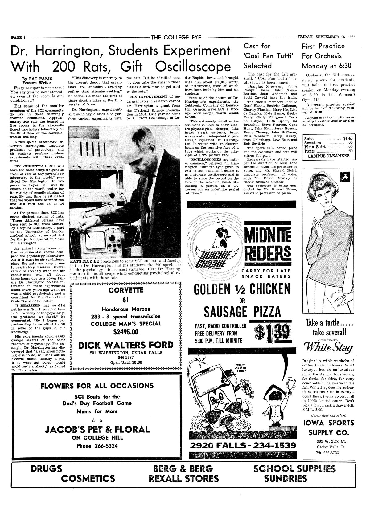 Dr. Harrington, students experiment with 200 rats, gift oscilloscope Professor Harrington talks about his plans for his rat colony; photo.