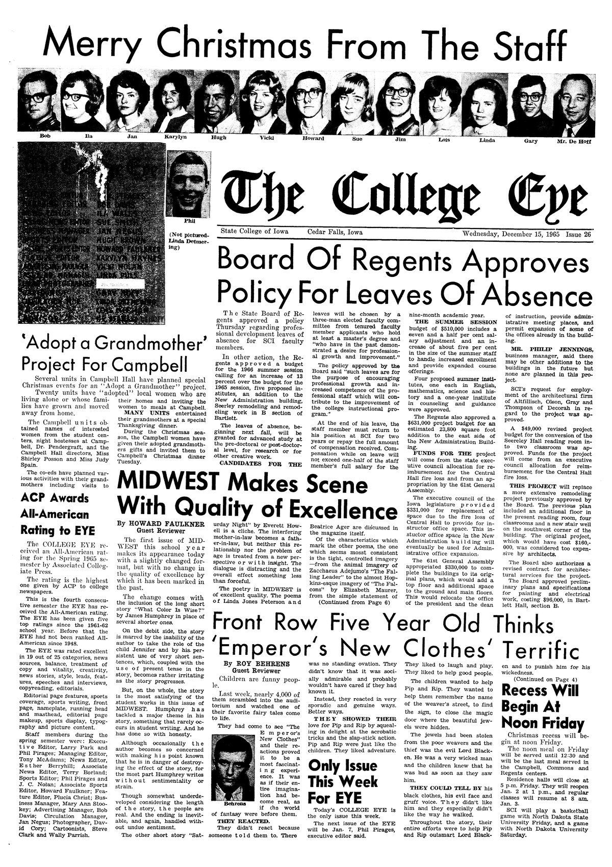 | Board of Regents approves policy for leaves of absence | Professional development leaves will foster advanced study; will begin in fall 1966; approve summer session and institutes; approve $631,000 for 23,800 square foot addition to Administration Building to make up for Central Hall loss. |