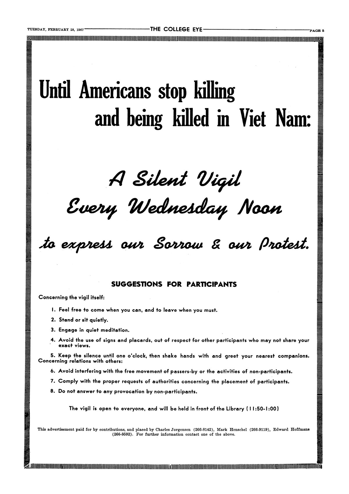 Until Americans stop killing and being killed in Viet Nam: Full page ad for noon vigils to be held every Wednesday.