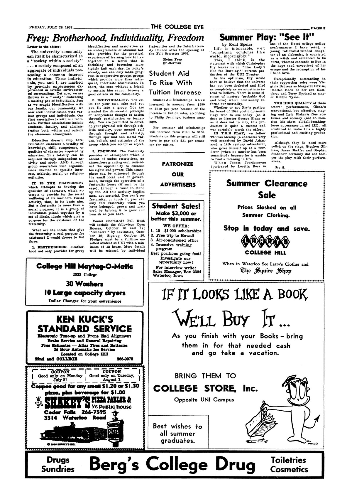 | Frey: brotherhood, individuality, freedom | Gives three ideals for which fraternities exist. |