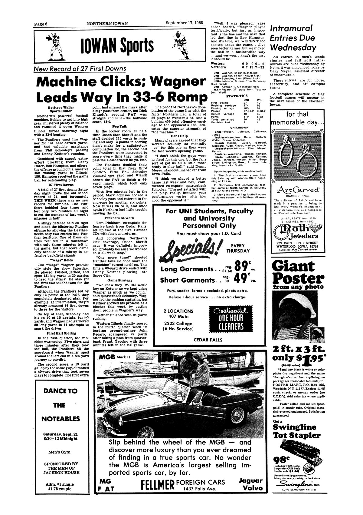 | Machine clicks; Wagner leads way in 33-6 romp; new record of 27 first downs | Panthers defeat Western Illinois, 33-6, last Saturday; UNI line-up listed.. |