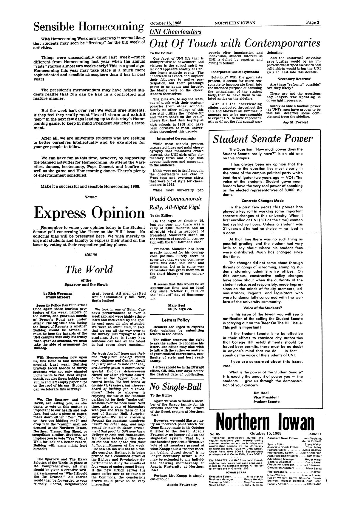 | The World of the Sparrow and the Hawk | Column takes a humorous look at a variety of topics, including arms for campus security, the draft, Brian Carney, and the new UNIon. |