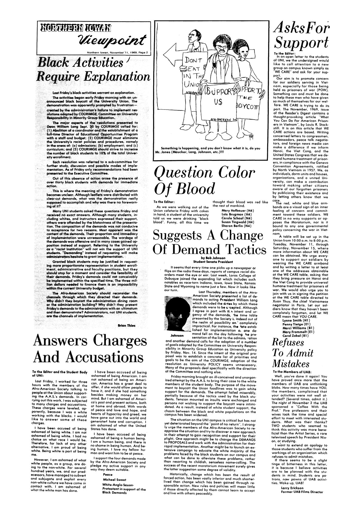 | Answers charges and accusations | Supports and will work for demands make by Afro-American Society. |