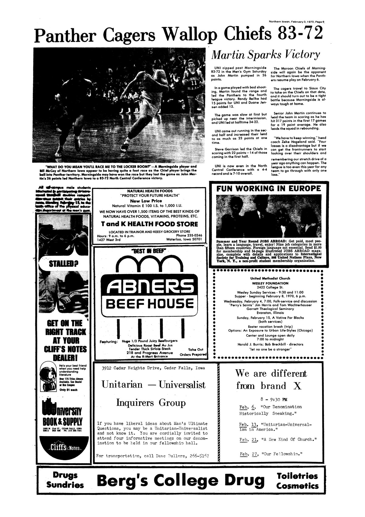 Panther cagers wallop Chiefs 83-72; Martin sparks victory UNI beat Morningside Saturday, 83-72; photo.