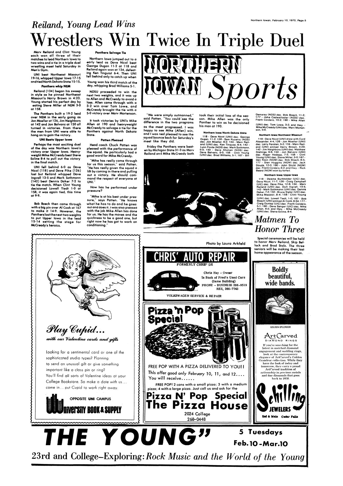 Wrestlers win twice in triple dual; Reiland, Young lead wins UNI beat Northeast Missouri and Upper Iowa in a dual meet held last Saturday; photo.