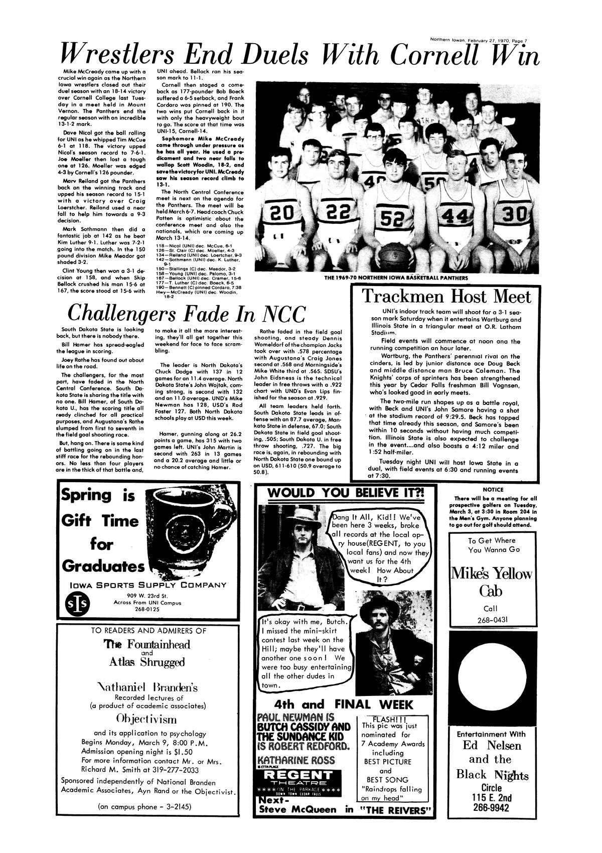 | Challengers fade in NCC | South Dakota University has clinched the NCC title for the 1969-70 season. UNI could get a tie for second place. |