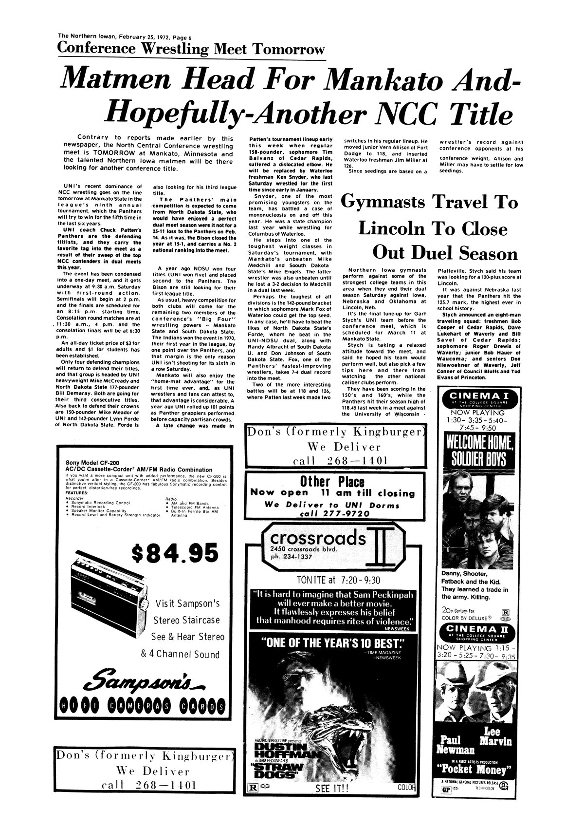 | Matmen head for Mankato and--hopefully--another NCC title; conference wrestling meet tomorrow | UNI will participate in the NCC conference wrestling tournament tomorrow at Mankato State. |