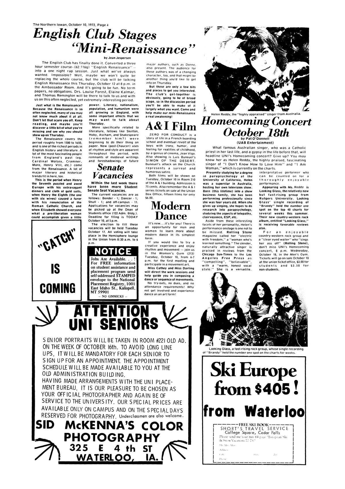 | Homecoming Concert October 18th | Helen Reddy and Looking Glass will perform; photo. |
