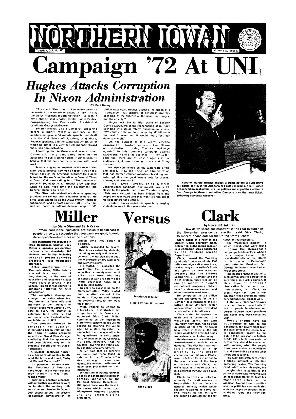 Campaign '72 at UNI; Hughes attacks corruption in Nixon administration Senator Hughes addresses large crowd; photo.