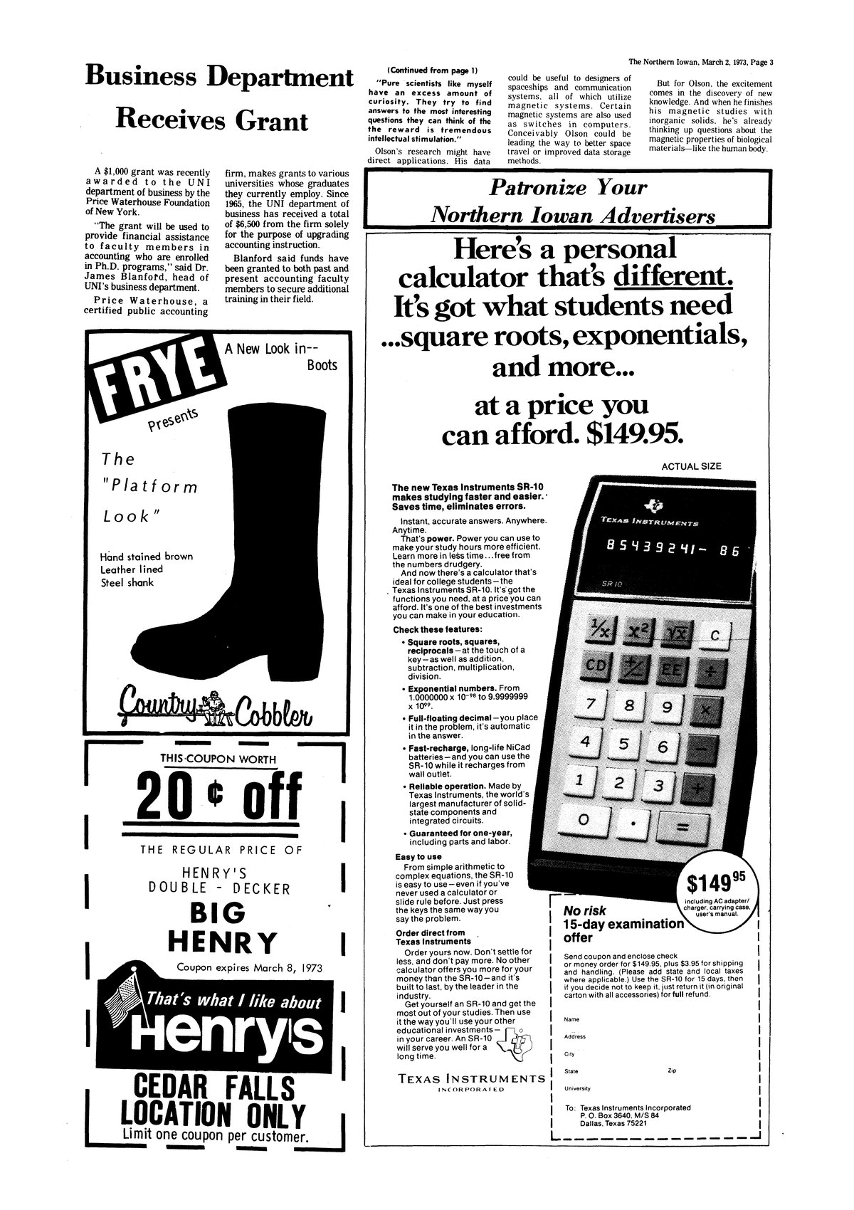 | Business department receives grant | Price Waterhouse grant of $1000 to be used to assist faculty members studying for doctorate. |
