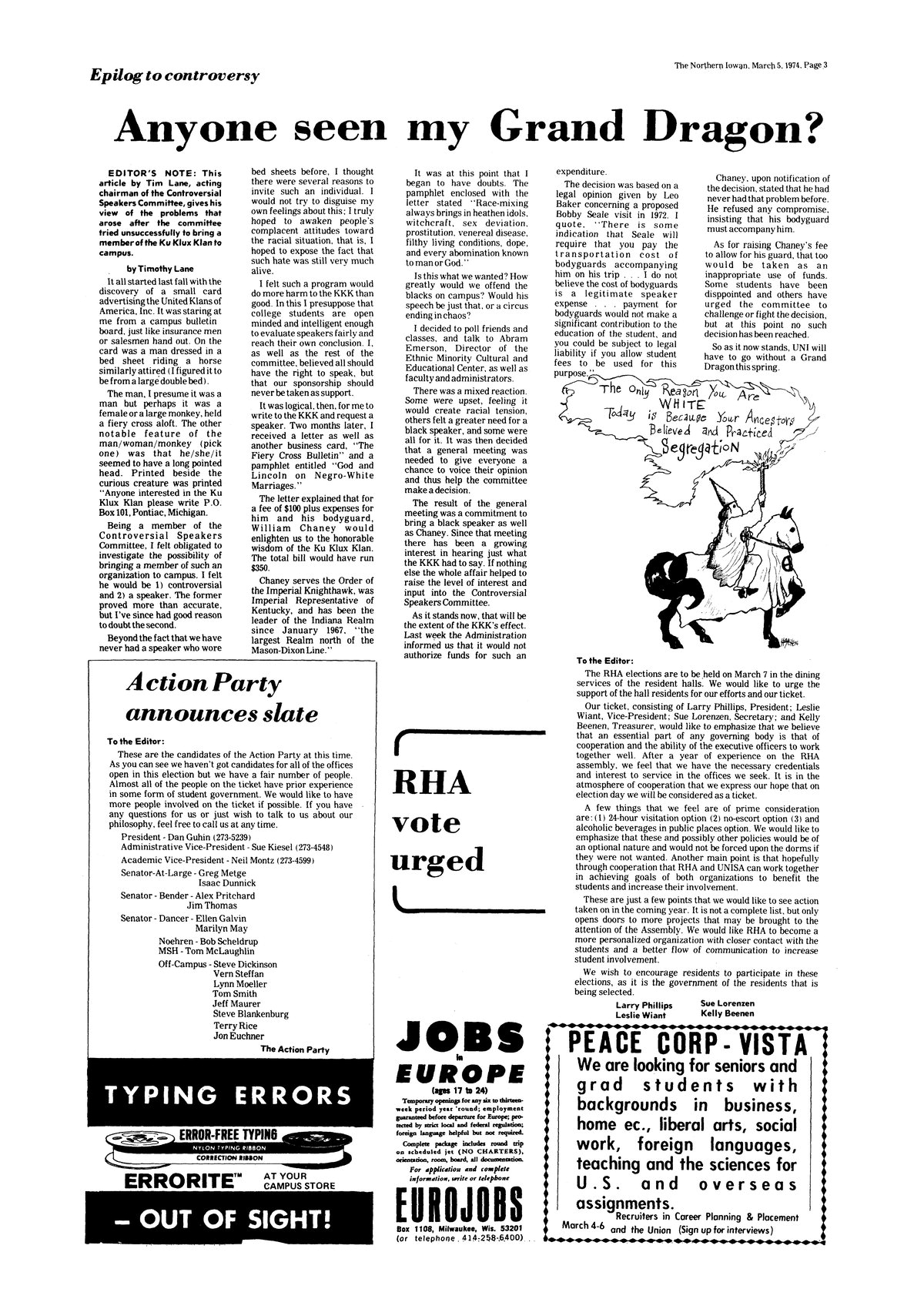 | Anyone seen my Grand Dragon?; epilog to controversy | Account of trying to get representative for Ku Klux Klan to campus. |