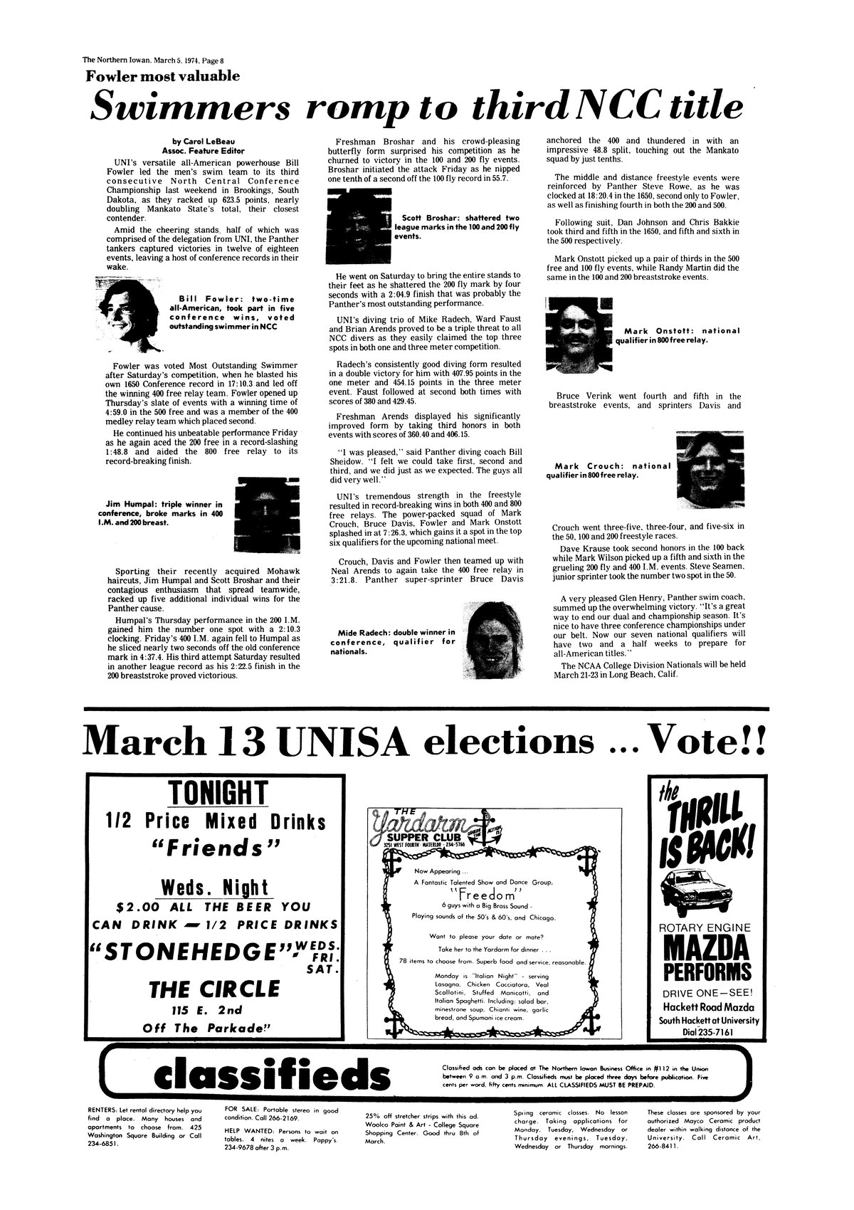| Swimmers romp to third NCC title; Fowler most valuable | Panthers win twelve of the eighteen events to capture the NCC championship title; photo. |