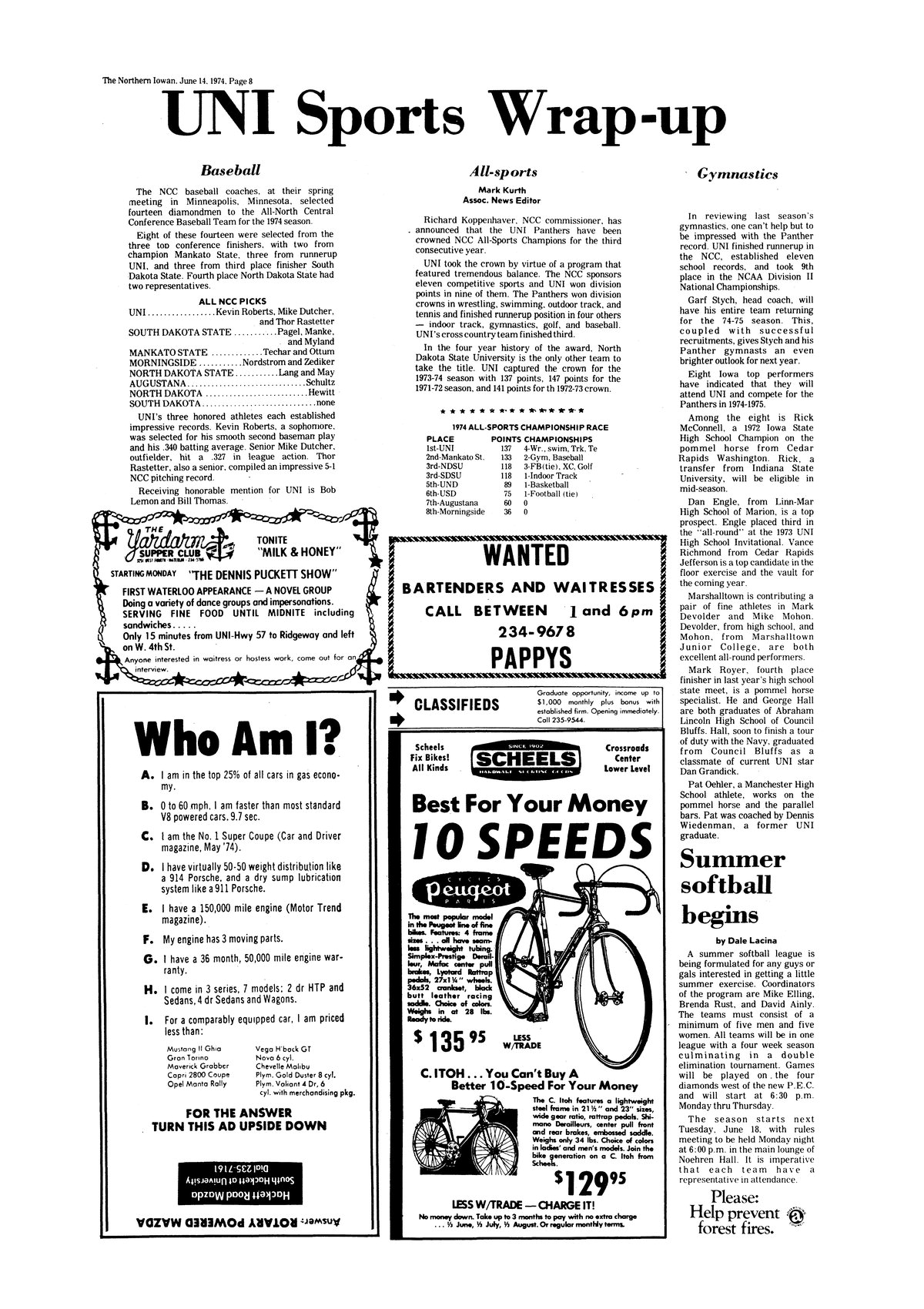 | UNI sports wrap-up | A review of the late happenings in baseball and gymnastics, as well as the picks for the 1974 All-Sports Championships. |