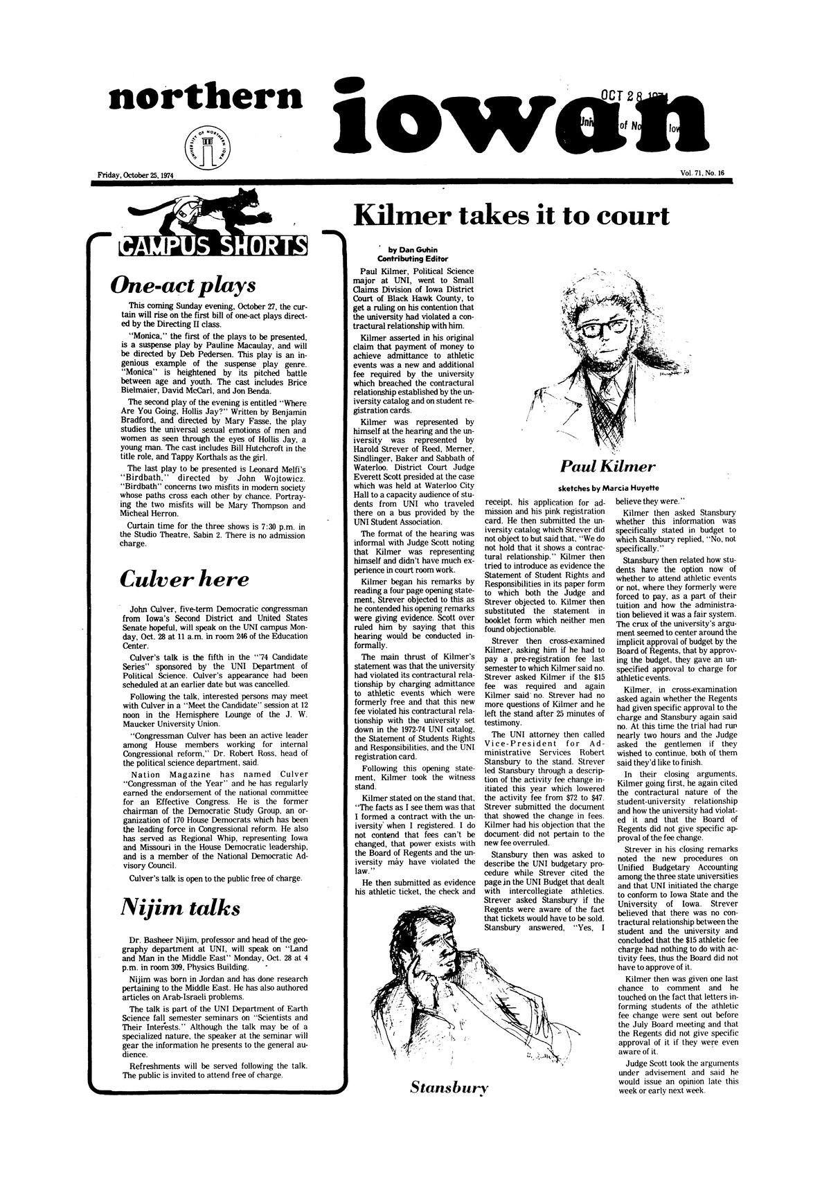 | Campus shorts | Students produce one-act plays; John Culver will speak; Professor Nijim will talk about the Middle East. |