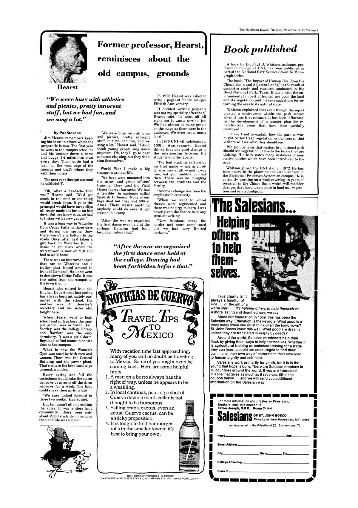 | Former professor, Hearst, reminisces about the old campus, grounds | Professor Hearst recalls troubles with old cars, early dances, World War I, his 1926 pageant, and the changed relationship between students and faculty. |