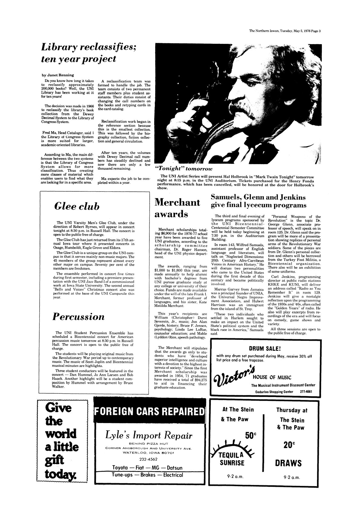 | "Tonight" tomorrow | Hal Holbrook will present "Mark Twain Tonight" at UNI tomorrow night; photo. |