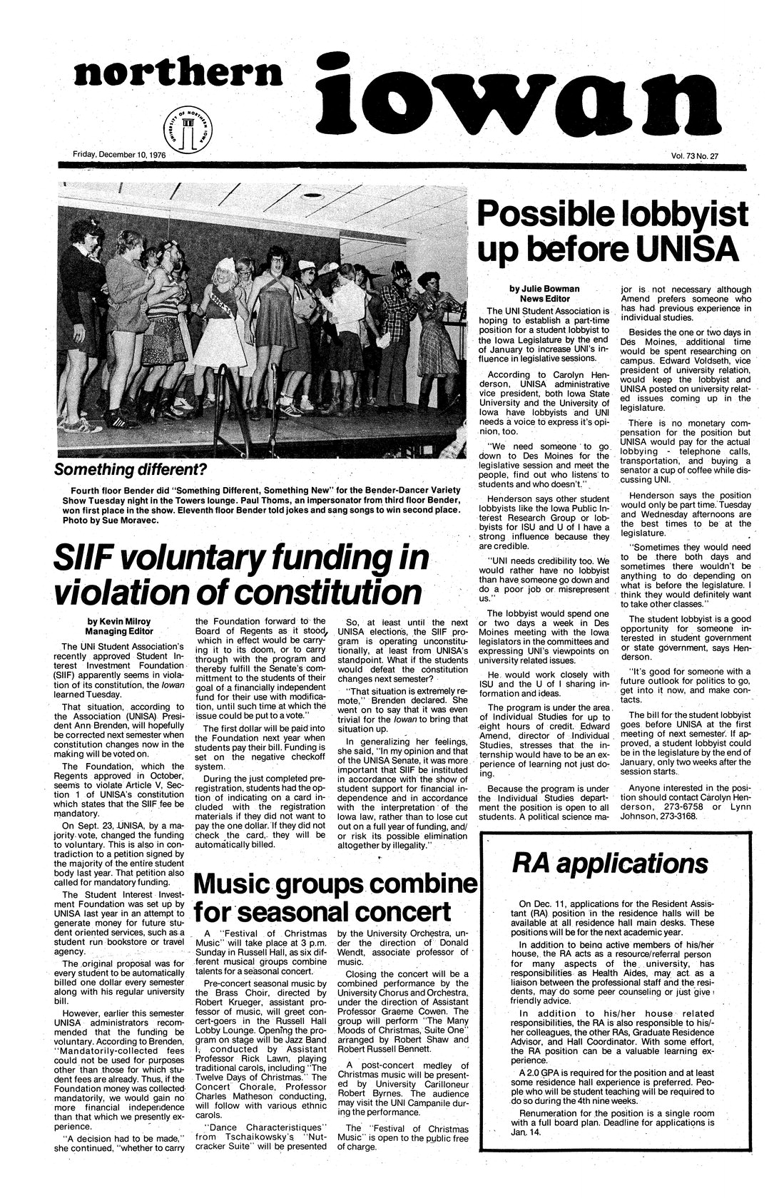 | Possible lobbyist up before UNISA | UNISA hopes to have a part-time position for a student lobbyist to the Iowa legislature. |