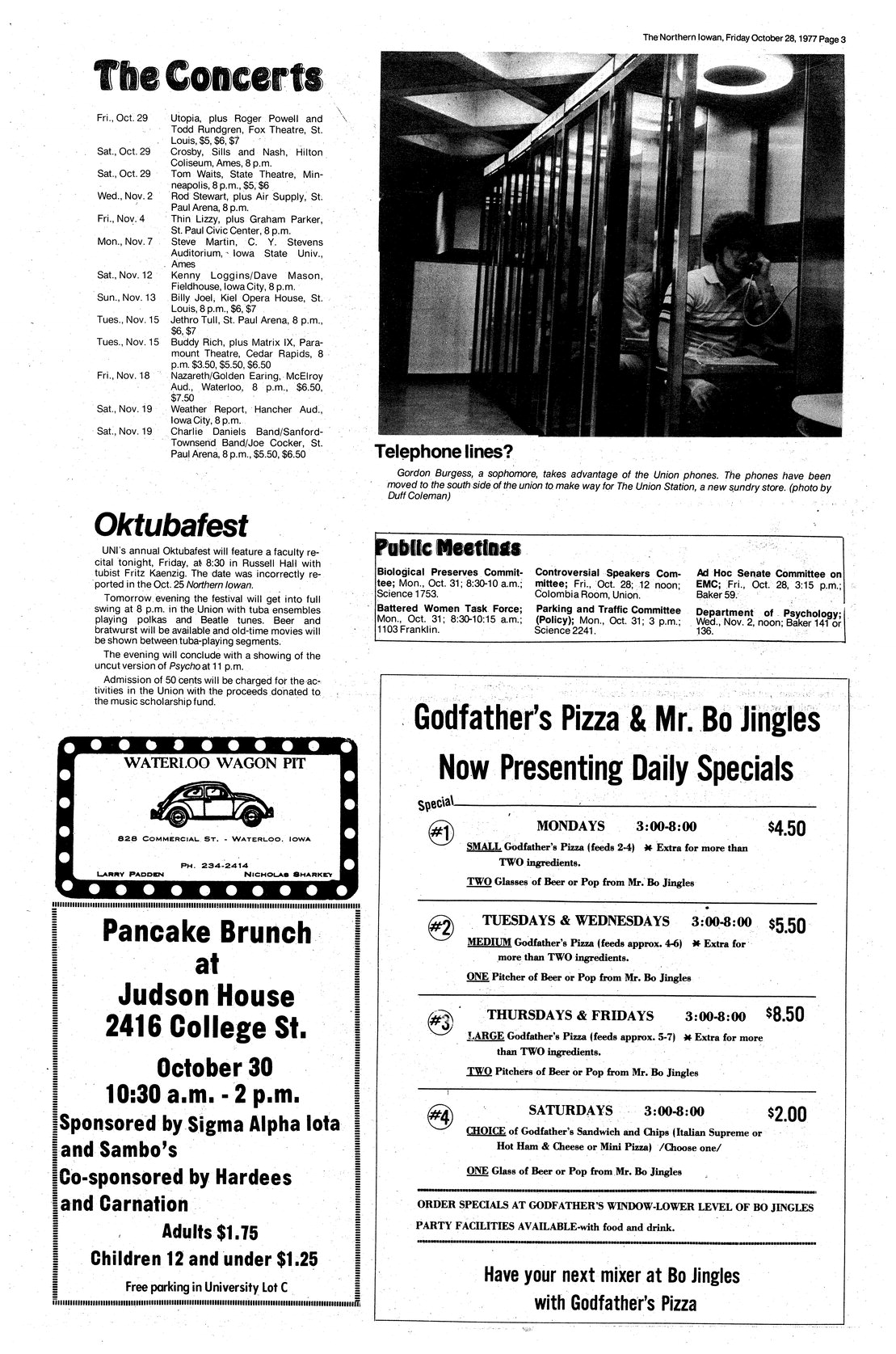| Telephone lines | A student uses the telephone, moved recently to make room for the Union Station; photo. |