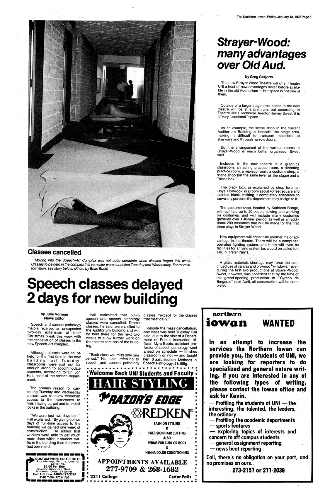 | Strayer-Wood: many advantages over Old Aud. | Although there seems to be a lack of space in some areas, the organization of the rooms is better than in the Auditorium; Theatre UNI staff talk about their new facilities. |