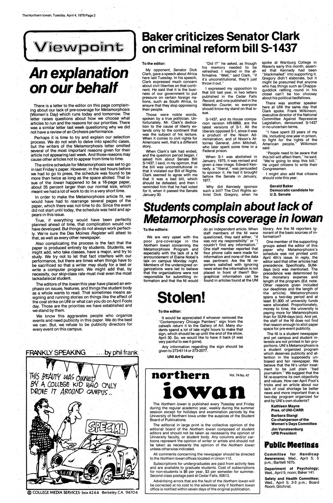 | Students complain about lack of Metamorphosis coverage in Iowan | Upset about poor coverage in the newspaper for the Metamorphosis Program. |