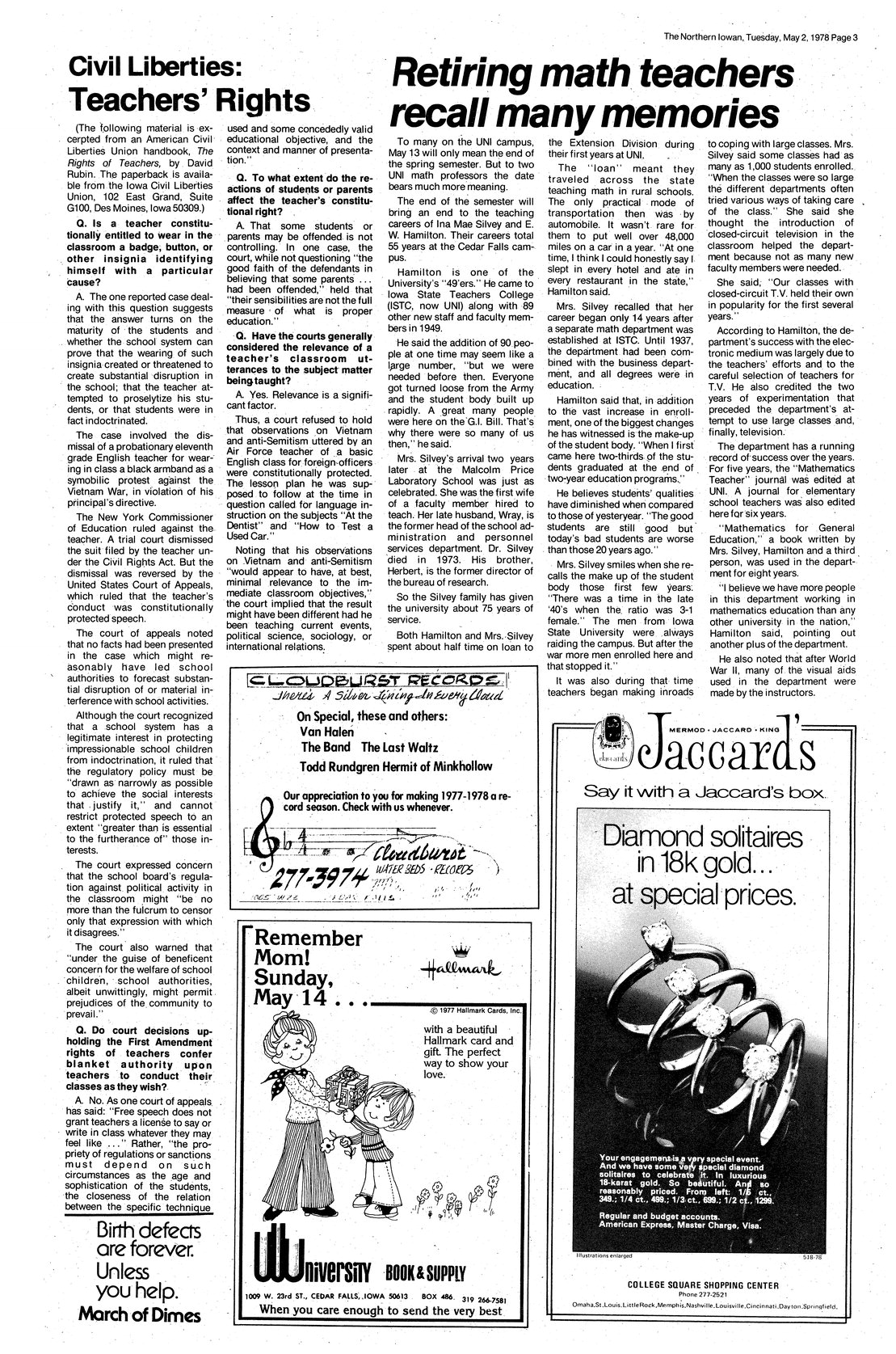 | Retiring math teachers recall many memories | Ina Mae Silvey and E. W. Hamilton look back at UNI history; remember work in Extension and closed circuit television classes. |