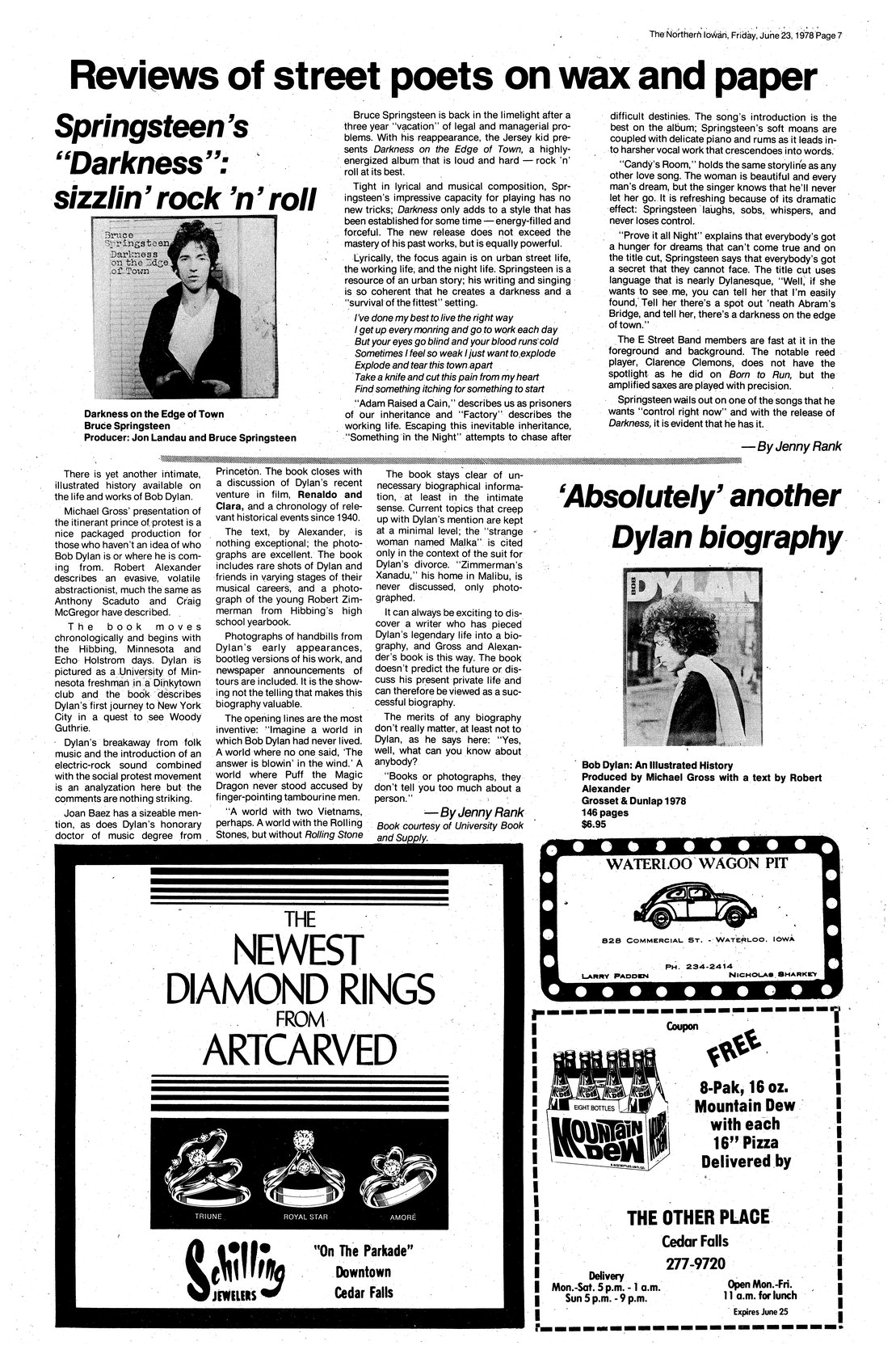 | Reviews of street poets on wax and paper; Springsteen's "Darkness": sizzlin' rock 'n' roll | Review of Bruce Springsteen's "Darkness on the Edge of Town." |