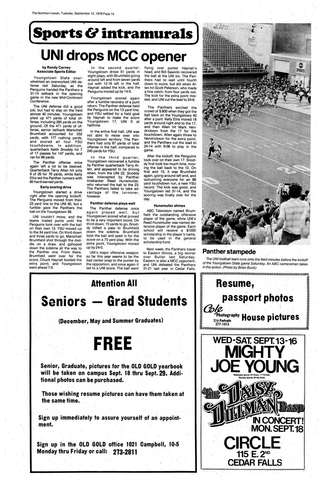 | UNI drops MCC opener | Panthers lose to Youngstown State, 31-14, but linebacker Reed Hunemuller named defensive player of the game; photo. |