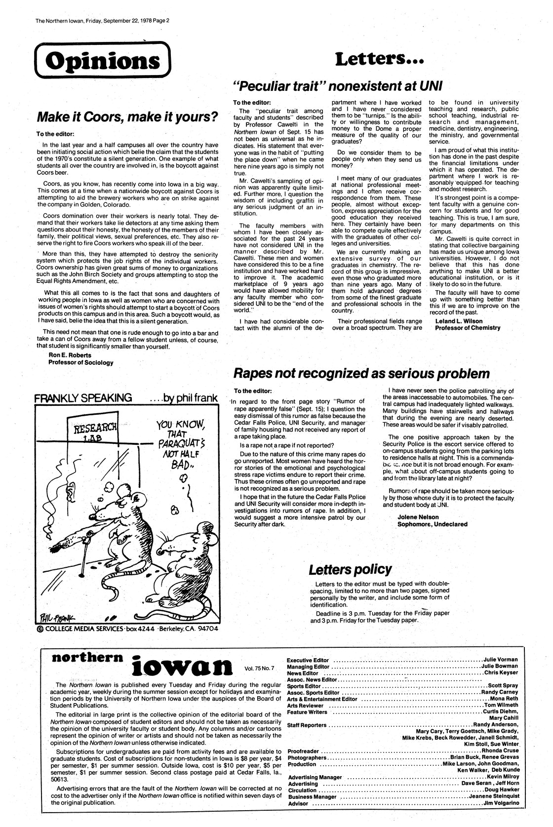 | "Peculiar trait" nonexistent at UNI | Professor Wilson disagrees with Professor Cawelti; does not believe that most faculty and students put down UNI. |