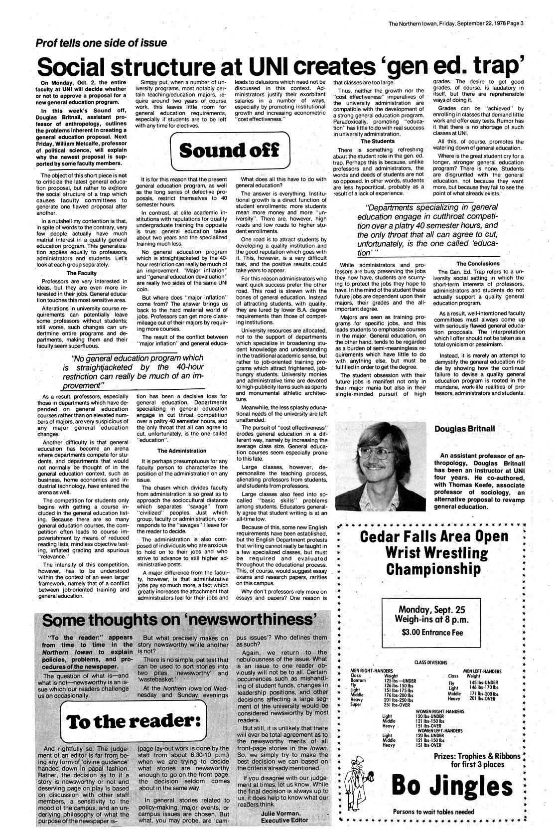 | Social structure at UNI creates 'gen ed. trap'; prof tells one side of issue | Cause of "General Education trap" explored examining the faculty, students, and administrators; does not believe that many people have strong interest in the success of the program; photo. |