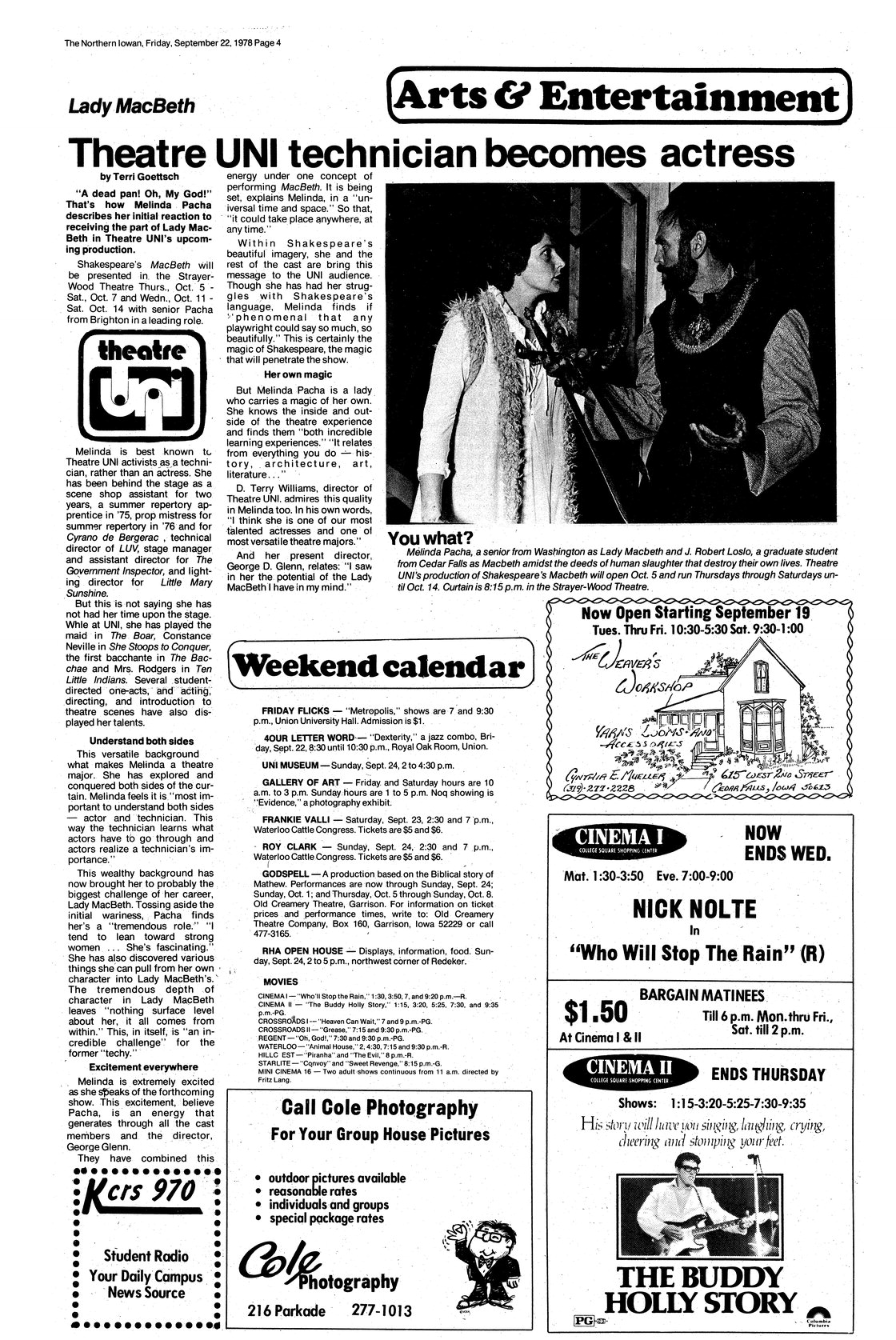 | Theatre UNI technician becomes actress; Lady MacBeth | Profile of Melinda Pacha; photo. |